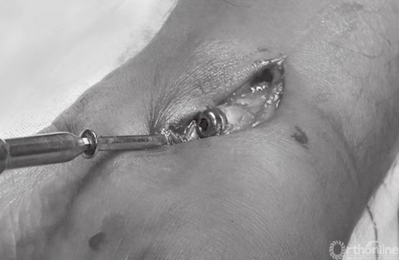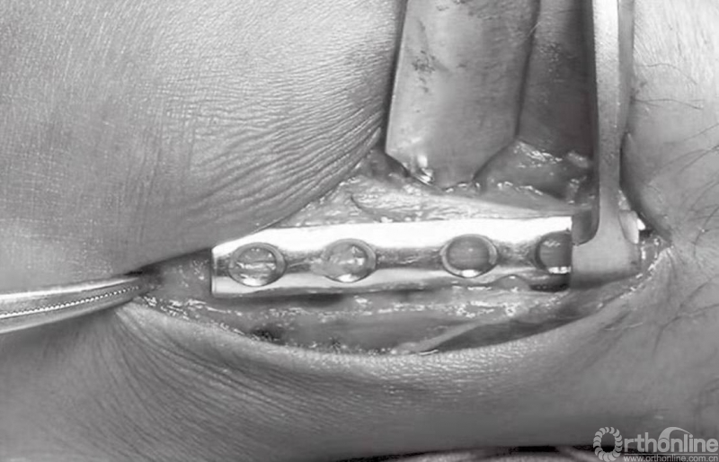 如果不能进行闭合复位,则经后外侧入路行切开复位。固定时,自后向前放置配有垫圈的4mm部分带螺纹的空心松质骨螺钉。如果骨折片在后内侧,则经后内侧入路进行复位,固定时螺钉从前向后放置。