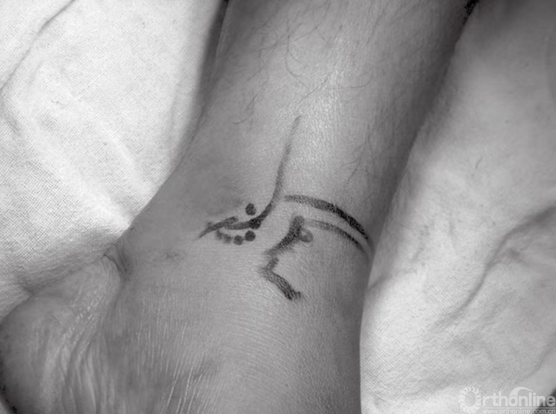 将折起的毛巾置于踝关节下。用记号笔标出骨点和骨折线,以辅助切开成口(图10)。切口时,建议避开不健康的皮肤。