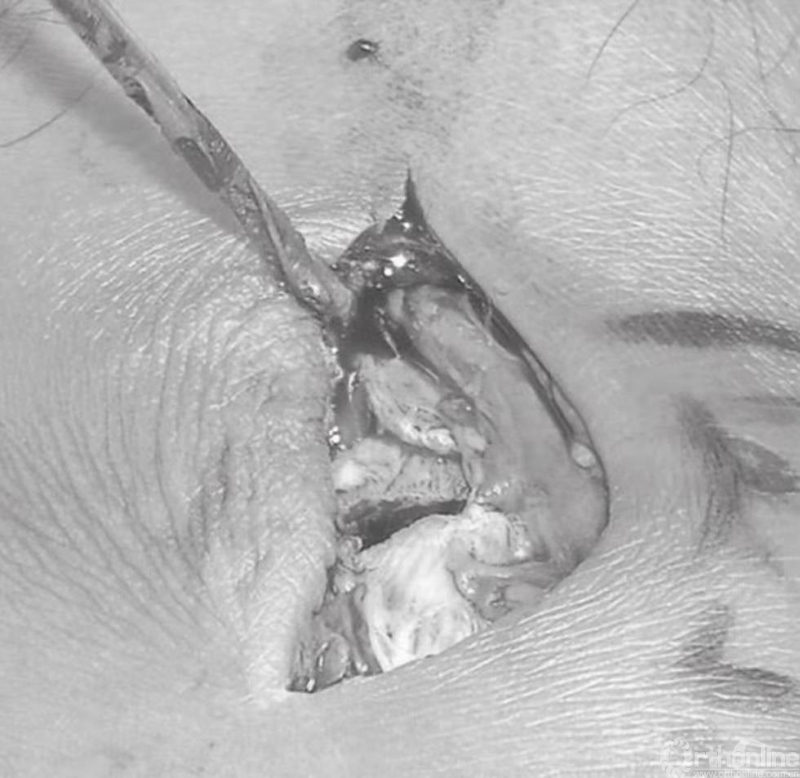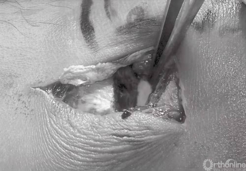 图3 切开皮肤后,沿着切口线分开深筋膜