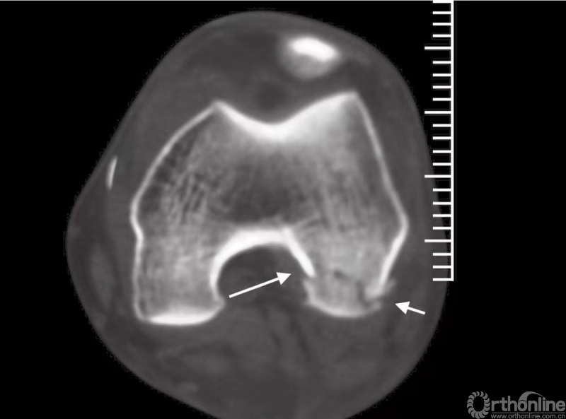 因此,不正确的正常膝关节视图将会给我们留下错误的印象,斜位片也可以帮助显示,因而,CT检查是必要的(图1)。而磁共振成像(MRI)会有助于评估膝关节周围软组织(例如韧带或半月板)损伤情况。