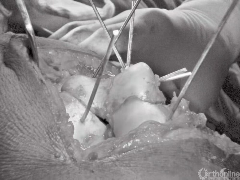 图3 双髁Hoffa骨折的术中克氏针临时复位固定,用克氏针对骨块进行撬拨复位