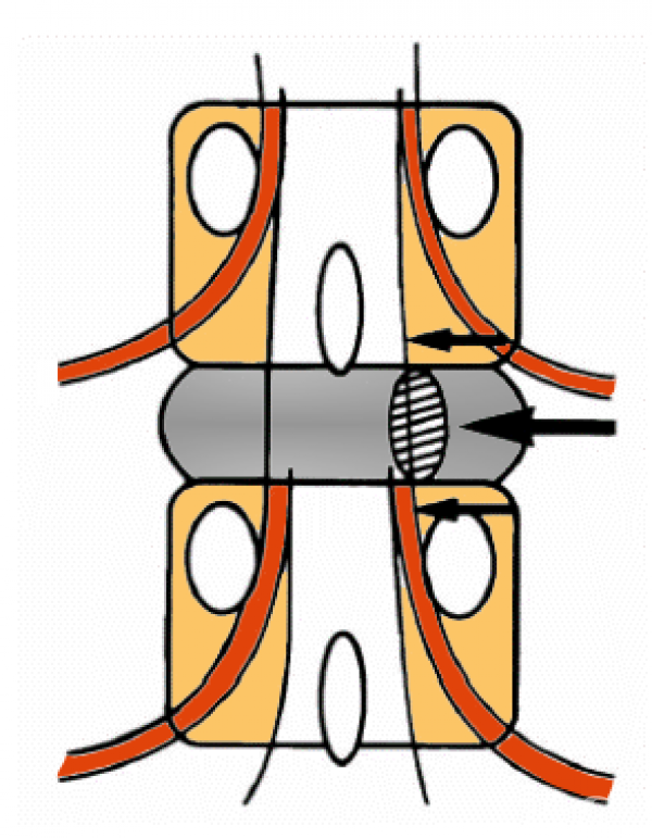 图 20.102 在既往纤维环开口或破口处,神经根往往被致密的疤痕组织粘连在椎间隙背面(大箭头)。手术分离的目标是分开疤痕组织上下方正常的硬膜囊(小箭头)
