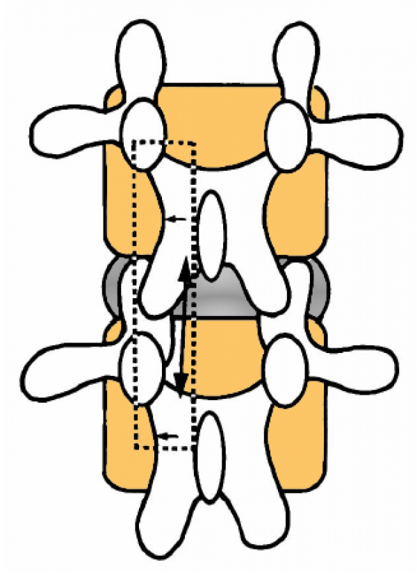 16、向外咬除骨质,咬除上、下关节突的内缘,看清外侧无疤痕的椎间盘区域。此时,你将认识到在椎间隙的下缘做皮肤标记线的价值所在。