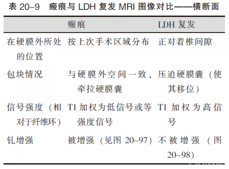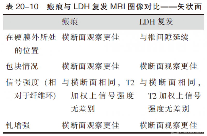 表20.9及表20.10总结了未增强MRI图像上复发LDH与疤痕组织区别的主要方面。矢状面及横断面图像可以互补来帮助判断。
