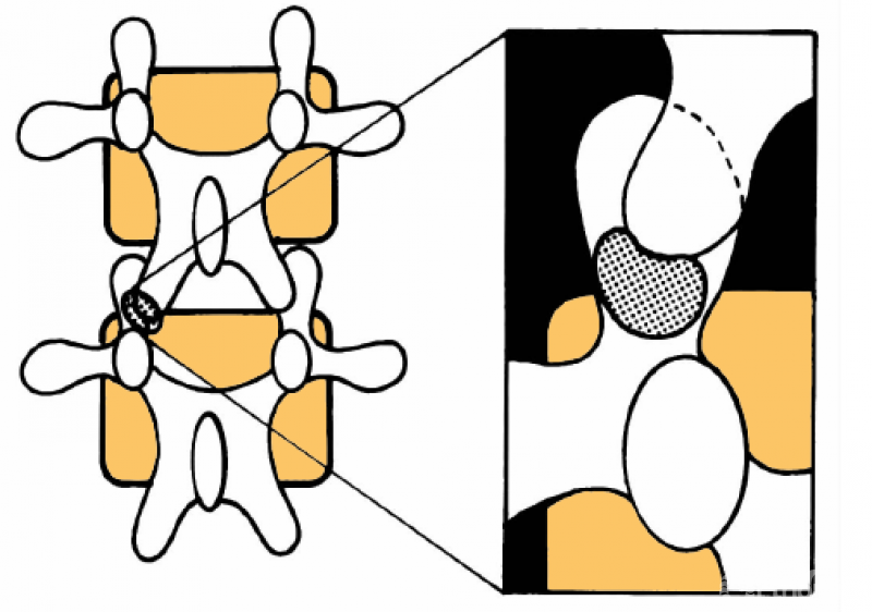 图 20.100 “安全窝”是下关节突下极的一个隐窝,尽管有既往手术史,往往仍残留有脂肪垫(斑点区域)