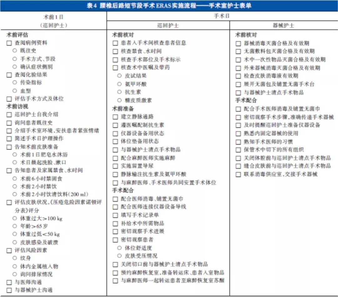 ERAS措施的个体化,应以患者的全面评估为基础。腰椎退行性疾病围手术期ERAS实施流程应“从评估开始,以评估结束”。