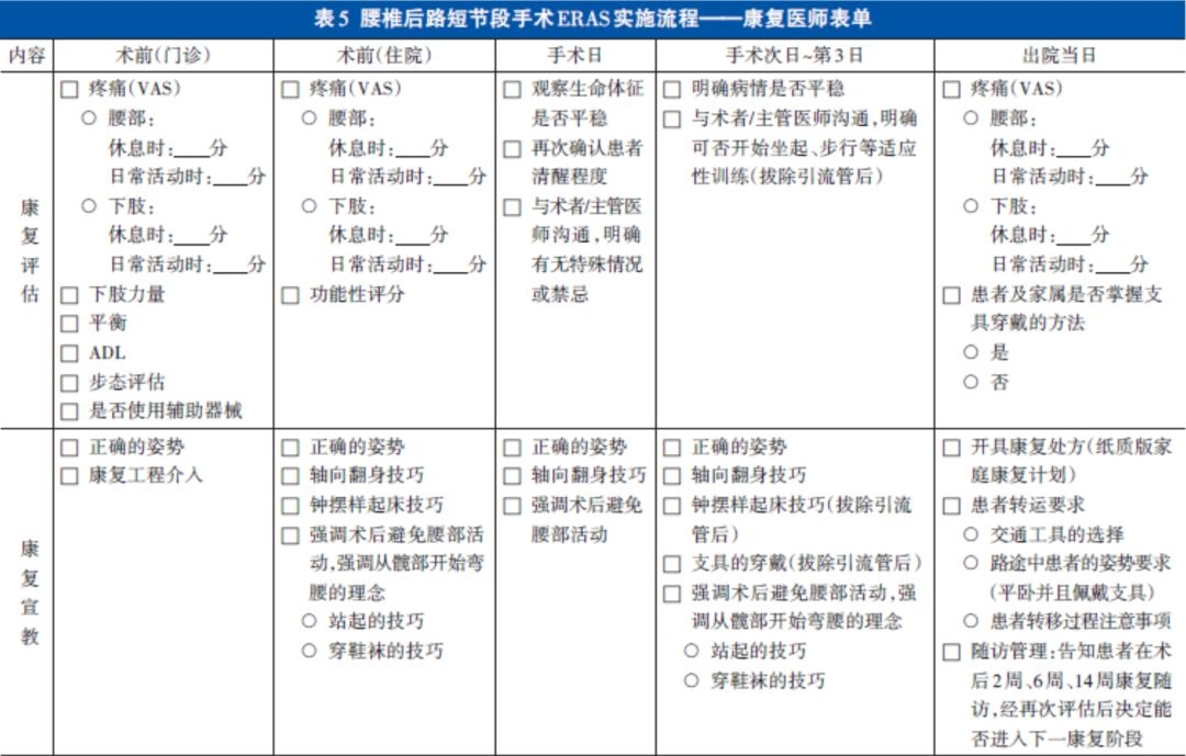 需要强调的是,该共识所涉及术式的实施流程需要脊柱外科医师、麻醉医师、病房与手术室护士、康复医师等多个科室成员共同配合完成,为了更便于临床操作,特制定了各科室成员的表单,详见表1~5。