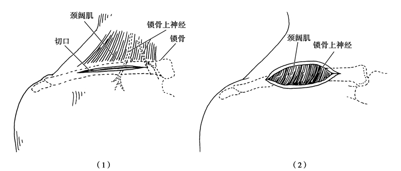 1.沿锁骨的S形解剖做切口,以病变位置为标志沿锁骨上缘向内外两侧延长,其部位及长短根据病变情况和手术要求而定(图7-1-1(1))。