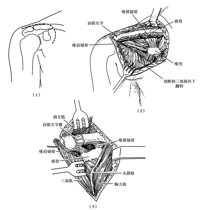 (1)切口;(2)显露三角肌起点,将其从肩峰前缘和锁骨分离,并向外下方翻转,显露喙突及其附着韧带;(3)显露肩锁关节