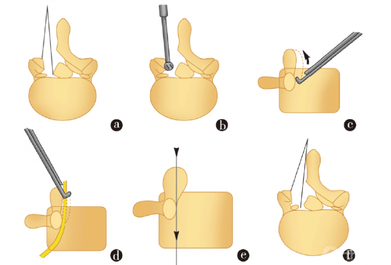 图2 a、b.同侧关节突关节下区减压,使用磨钻的情况;c.上关节突内缘增生肥大,从其下缘开始咬除比较安全;d.使用Kerrison咬骨钳从上关节突上部开始咬骨,可能会损伤其业已受压的神经根;e.需要切除上关节突内侧到达椎弓根内侧缘;f.轴位观