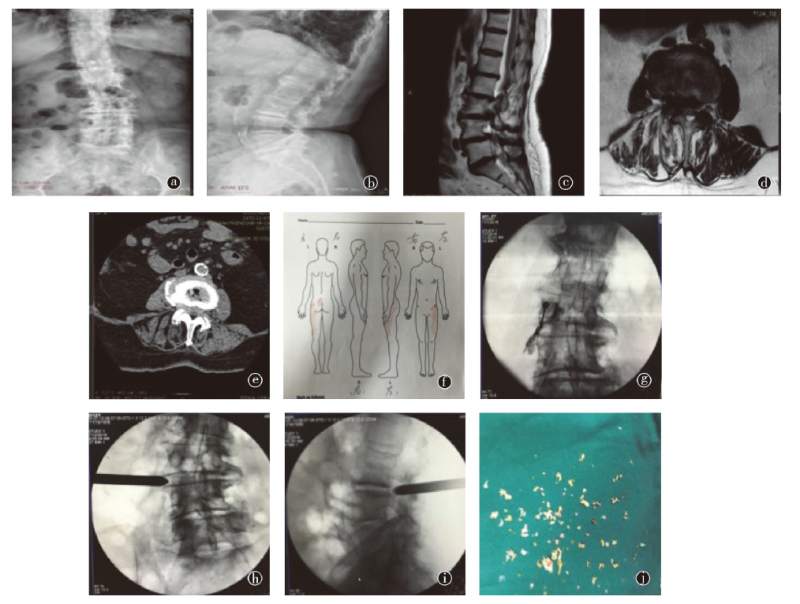 图3 患者女性,85岁,因左下肢疼痛伴间歇性跛行6个月就诊,查体:左侧大腿前外侧痛觉略减退,余(-)。a、b.术前正侧位X线片;c.腰椎MRI矢状位T2像;d.L3~4MRI横断面扫描;e.L3~4 CT横断面扫描(软组织窗);f.术前患者的疼痛图谱;g.术前左侧L3神经根封闭;h、i.侧路全内镜下L3神经根减压;j.术中取出的椎间盘及韧带组织