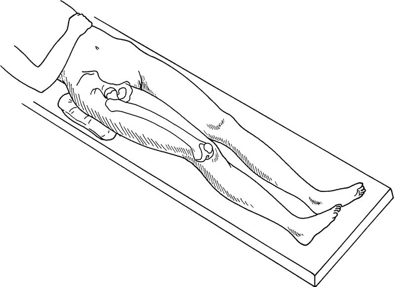 患者仰卧于手术台上,如果要行骨盆截骨,需在患侧骨盆下垫一小沙袋,使患侧骨盆向对侧倾斜(图8-1-1)。