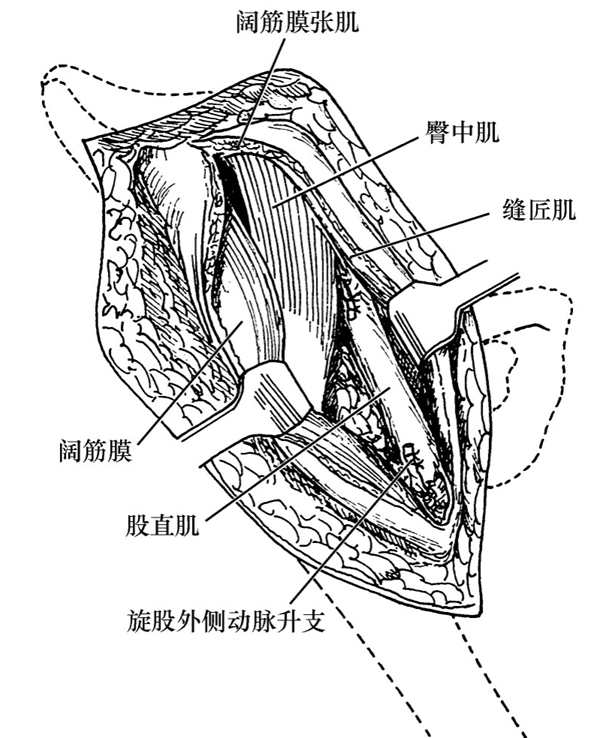紧贴阔筋膜张肌内侧缘切开深筋膜,将缝匠肌牵向内上方、阔筋膜张肌牵向外下方,即可显露深部的股直肌和臀中肌(图8-1-4)。