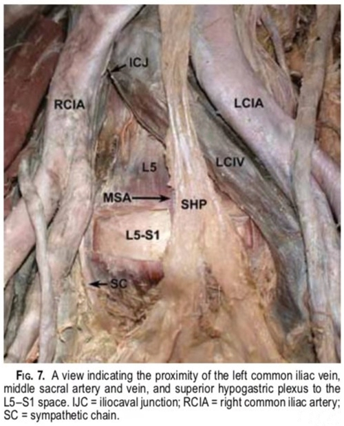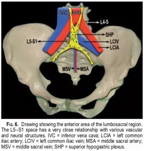 椎体前方就是下腔静脉IVC、腹部神经丛SHP、髂总动静脉CIA/V、骶正中动静脉MSA/V、交感链SC。