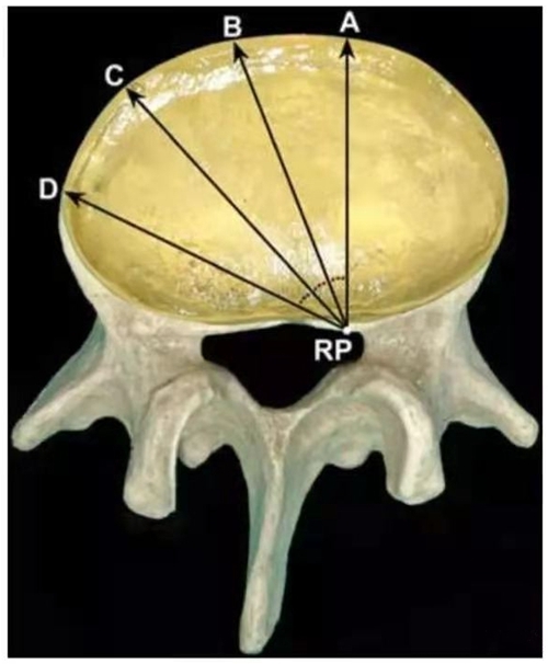 L1-S1间盘高度一般在1-1.5cm左右。相应神经根、椎弓根、间盘之间的距离关系也在增加,但总体都在一个不大的范围之内。