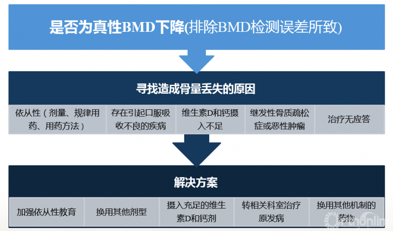 BTM改变幅度小于LSC,并不一定需要停药或更换治疗方案。应该首先评估患者的依从性,其次排除继发性因素;还要考虑钙和维生素D补充是否充足、患者消化吸收功能、前后检测的试验条件是否相同等。