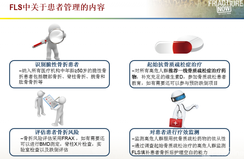 患者管理系统对于骨质疏松症治疗也很重要。针对骨质疏松症患者的综合管理措施可以提高脆性骨折患者骨质疏松症的管理率、诊断率;提高抗骨质疏松症治疗药物的使用率和依从性;达到降低再骨折和提高患者生活质量的预期效果。