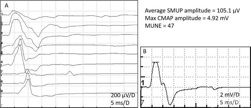 图1.一名18岁的平山病男性患者。在症状较轻的一侧小指展肌的MUNE值减少,同时CMAP波幅降低,SMUP平均波幅增加。左图(A)显示了腕关节(1-3)、腕近端4厘米(4-6)和肘部(7-9)的三个增量,右图(B)显示了最大CMAP。SMUP:单个运动单位电位;CMAP:复合肌肉动作电位;MUNE:运动单位数目估计