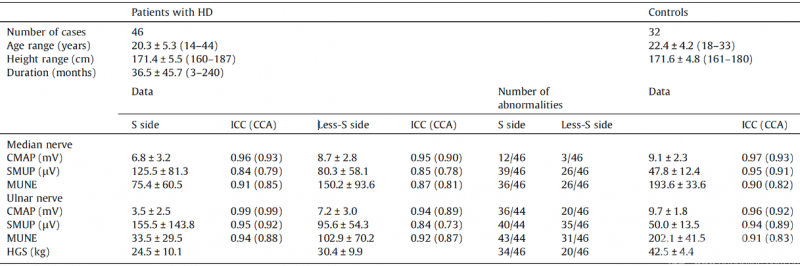 表1:平山病患者和对照组MUNE和握力的测量结果