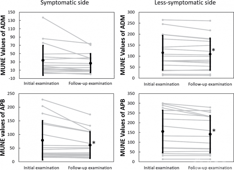 图4.单独病例(灰线)显示MUNE在初次检查和1年随访检查之间的变化,黑色粗线代表平均值和标准差。*平山病患者的MUNE平均值在随访检查中显著下降(P<0.05)