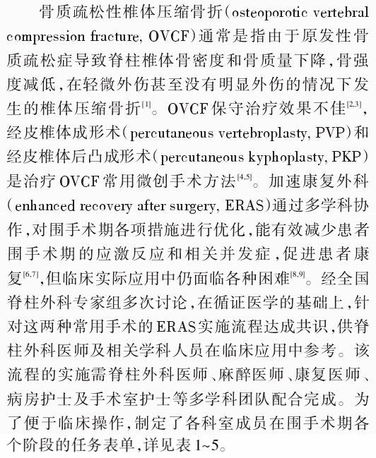 我们在编订的《脊柱外科加速康复-围术期管理策略专家共识》的基础上,结合PVP/PKP手术特点,经全国专家组反复讨论,达成了相关实施流程的专家共识,供脊柱外科医师在临床工作中参考。