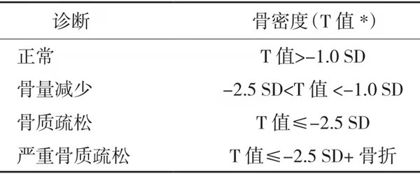 世界卫生组织(WHO)对骨质疏松症的诊断标准为在同种族和同性别中骨密度低于年轻成年人峰值的2.5个标准差(T值小于-2.5)。