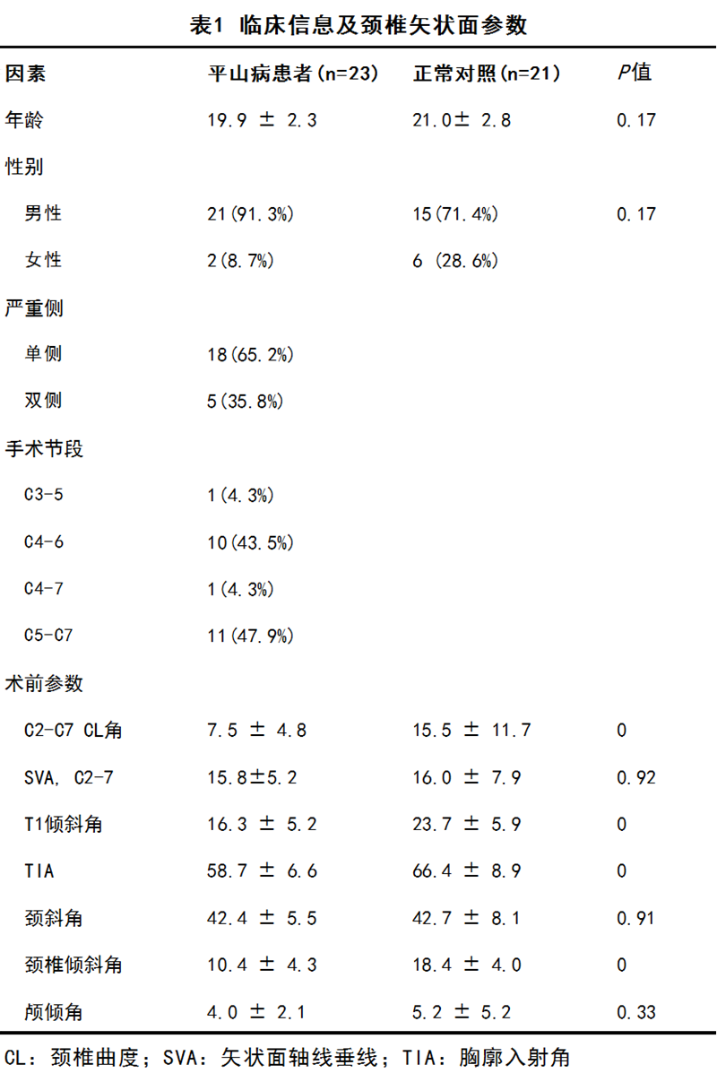 我们对2013年1月1日至2018年1月1日在本中心接受颈椎前路融合术(anterior cervical fusion, ACF)的23例平山病进行了回顾性研究,并同期纳入21例年龄匹配的健康青少年为对照组。与无失衡的正常受试者进行比较的优势在于可以证实平山病患者可能存在颈椎矢状面失衡。
