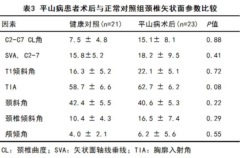 材料和方法:回顾性分析了44例的颈椎矢状面参数,其中平山病组23例,健康青少年对照组21例。采集平山病患者手术前后颈椎矢状面参数以及健康青少年颈椎矢状面参数。比较平山病患者和健康青少年的矢状面平衡参数以及平山病患者手术前后的矢状面参数。