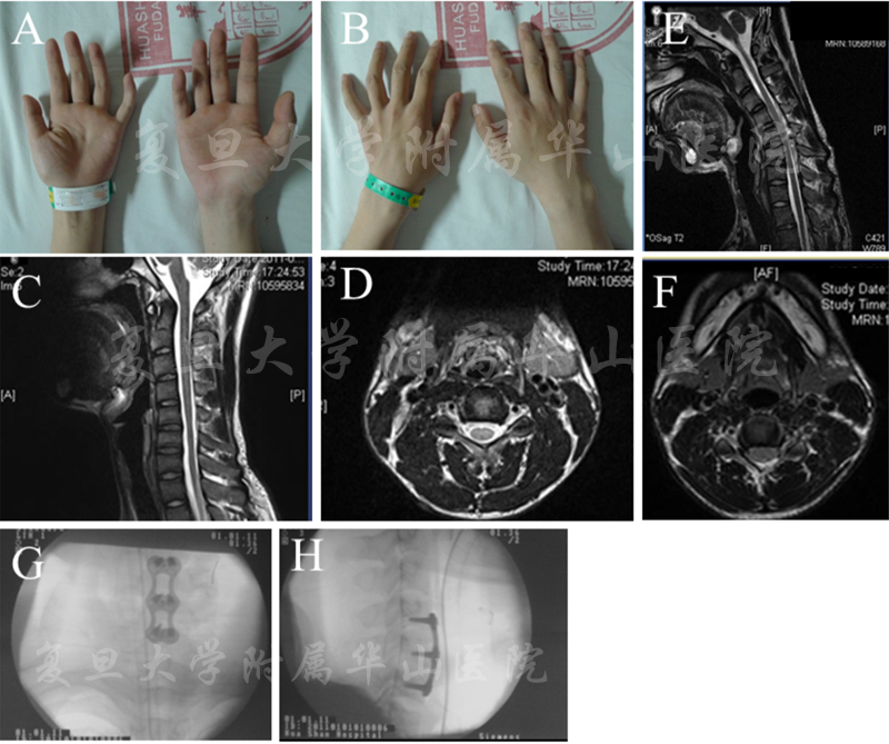 图2 一名21岁的平山病患者接受了CF手术。A,B:与右手相比患者左手存在明显萎缩;C,D:MRI显示C5-6节段脊髓变细;E,F:屈颈位MRI示硬膜囊及脊髓前移;G,H:ACF术后颈椎正侧位X线。
