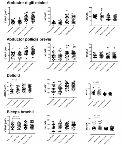 MUNIX:存在近端累及的41例患者中,28例患者在术前及术后平均12.6±2.2月接受了MUNIX测定。所有的电生理相关检查使用Keypoint肌电图仪(version2.32; Medtronic Dantec, Skovlunde, Denmark),同时保持皮肤温度32℃。同时,为排除检查者影响,所有检查均由同一检查者完成。