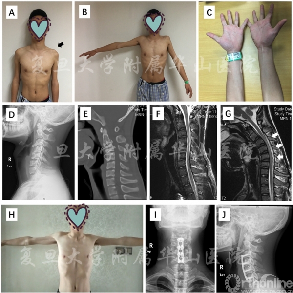 Fig2 一例通过颈椎前路融合内固定手术治疗的近端组平山病患者 A-B:左侧近端肌肉存在显著的肌无力和肌萎缩(黑色箭头);C:双上肢远端无明显肌无力或肌萎缩;D-E:颈椎X光及CT均提示颈椎前凸曲度的丢失;F-G:在MRI中,颈椎中立位未见明显异常,屈颈位可见后方硬膜囊前移及“新月形”流空影(白色箭头);H:患者术后运动功能较前改善;I-J:患者接受了C3-4,C4-5及C5-6三节段的融合