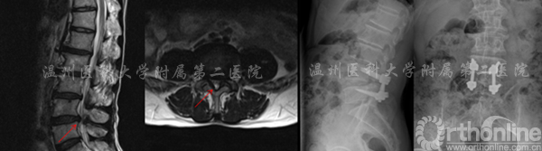 术前MRI提示:腰4/5管狭窄(左) 术后X线提示:固定良好(右)