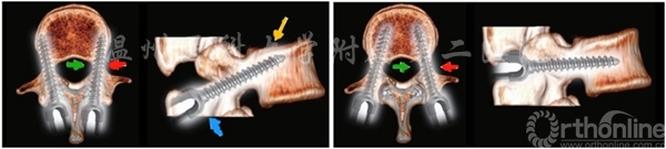 图1 绿色箭头:椎弓根后内侧壁;红色箭头:椎弓根前外侧壁