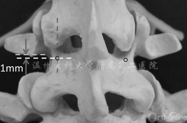 Ivanov等人发现峡部的厚度从内侧至外侧边缘逐渐增加,而进针点选择在为上关节突中线与横突下1mm之间的交点,大致位于峡部外侧缘向内3mm左右,正好位于椎体背侧皮质骨且接近峡部外侧处(图2)[3]。