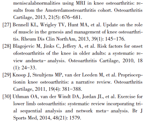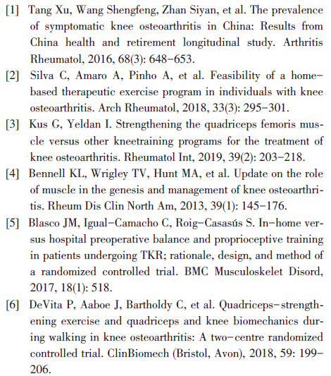 至于髋外展和内收肌群训练,因为学界对于膝骨关节炎患者的髋关节内收肌群肌肌力变化存在争议[7-9],该方法在原理上的合理性有待进一步研究证实,临床上也较少使用。