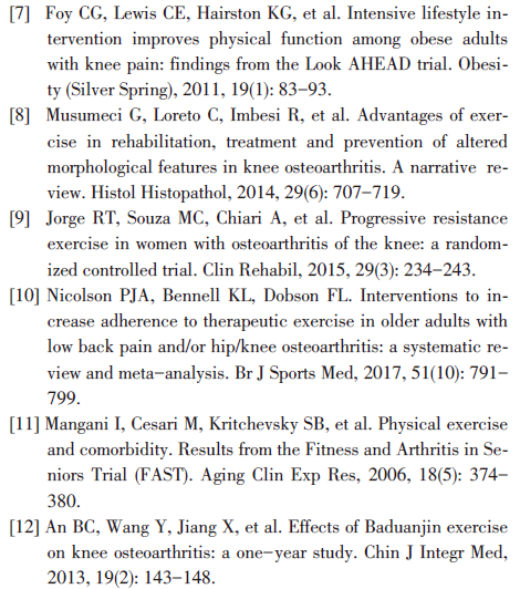Mangani[11]等对435例KOA患者进行一项为期18个月的随机对照临床试验,结果发现有氧运动能够显著缓解关节疼痛、提高步行速度,并且降低功能障碍评分。随着中国传统医学的进步与推广,太极拳、八段锦等具有中国特色的有氧运动方式逐渐广泛应用于KOA的预防与治疗。An[12]发现经过1年的八段锦练习后,患者WOMAC评分、SF-36评分明显得到改善,并且治疗过程中没有不良反应发生。