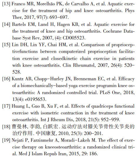 其他运动治疗方法还包括:手法治疗技术、本体感受训练[15]、神经生理疗法以及基于生物力学的瑜伽训练[16]等,根据文献报道均有不同程度改善膝关节功能,促进患者康复的治疗作用。
