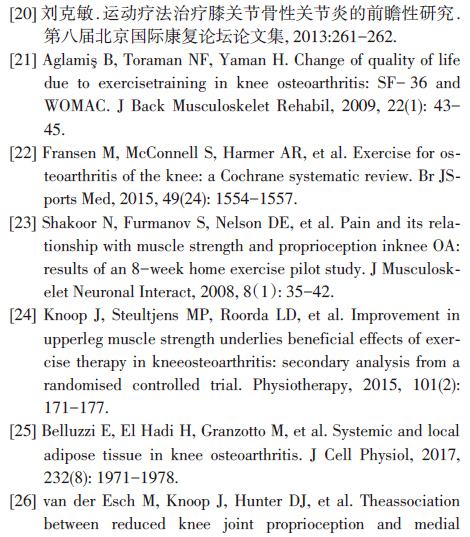 Lin等[15]研究发现,基于改善本体感觉功能的运动治疗方式能够显著增加膝关节伸肌力矩,并且有效改善膝关节位置觉、行走速度以及肌肉力量。然而,部分研究结果表明,本体感觉的改善并不能显著提高WOMAC 功能评分以及KOOS 评分[30,31]。