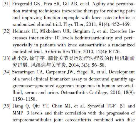 MMP-3是基质金属蛋白酶家族(matrix metalloprotein, MMPs)中重要的成员之一,参与降解多种细胞外基质[34];同时MMP-3能够激活其他基质金属蛋白酶原,进一步加速软骨破坏和骨关节炎的发病[35]。在另一项为期4周的随机对照临床试验中,陈辉等[36]发现,与单独药物治疗相比,运动结合双氯芬酸治疗KOA能够更加显著地降低关节滑液中MMP-3的含量,一定程度上延缓关节软骨退变进程。