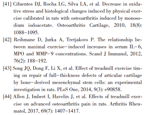 Song等[43]通过手术方法建立大鼠骨关节炎模型,并且进一步研究发现,4周的中等强度运动能够促进Ⅱ型胶原、蛋白聚糖相关基因表达,同时改善大鼠关节软骨的形态学、组织学以及免疫学评分。
