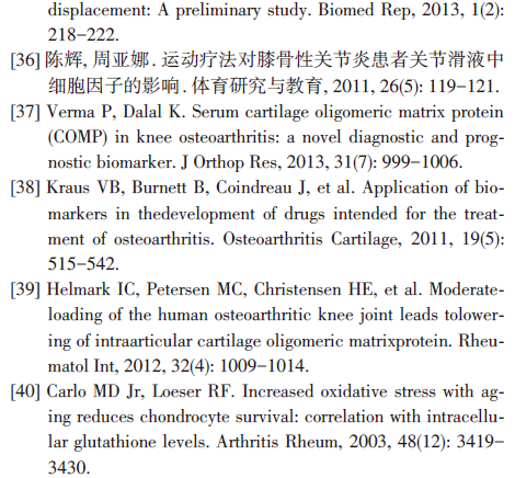 软骨寡聚基质蛋白(cartilage oligo⁃meric matrix protein, COMP)是目前应用最为广泛的关节疾病生物学标志物,能够较好的反映骨关节炎的潜在风险以及骨关节炎疾病的发生、发展和预后情况[37]。研究表明,运动治疗能够显著降低血清及关节滑液中COMP浓度[38,39]。这也间接反映运动治疗在调节关节软骨代谢、降低软骨丢失量方面的潜在作用,但其具体机制尚不明确,仍需进一步研究。