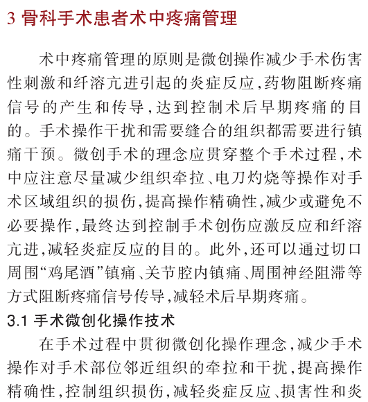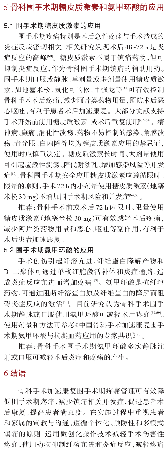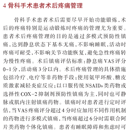 本指南主要内容包括骨科围手术期疼痛管理的目的、原则、疼痛分类及评估方法,根据不同患者术前、术中、术后的疼痛特点归纳了一系列镇痛措施,并强调了氨甲环酸和糖皮质激素在围手术期抑制炎症反应、减轻疼痛中的作用。