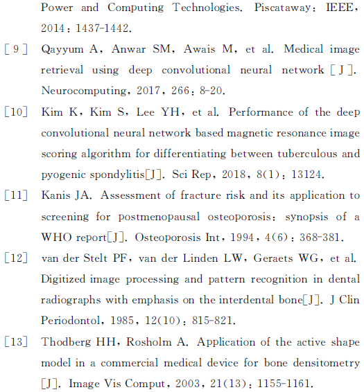 骨质疏松是以骨量降低与骨组织微结构破坏为特征的代谢性疾病。影像学检查是骨质疏松诊断与评估的重要方法。临床医师主要通过人工方法进行阅片与分析,以个人临床工作经验为基础判断患者病情。然而,人工阅片有两大缺陷:一是识别效率有限;二是不同阅片者的水平与经验差异会导致诊断结果不一致[1]。