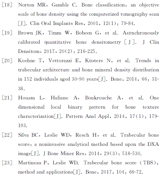 Houam等[21]将局部二值模式进行改进,从平面内多条直线上记录骨小梁灰度变化,并同时结合骨松质整体分析,提出一维局部二值模式,用于骨小梁结构自动识别,这一图像识别模式对骨质疏松患者的筛选敏感率比传统模式更高。