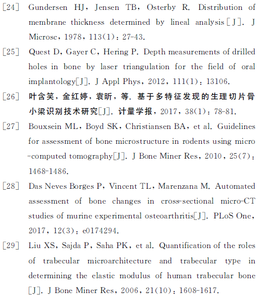 随着影像技术的进步,微CT的出现使骨小梁参数测量精确度大大提升,也使骨质疏松自动化识别踏入新的领域。Bouxsein等[27]针对微CT影像,制订了骨小梁识别过程中各步骤的操作指南与相关指标记录标准,对图像识别技术在微CT识别中的应用进行规范化,为这一技术在未来的广泛使用提供了可能。Das Neves Borges等[28]诱导小鼠发生骨关节炎,并使用影像识别软件依据微CT影像测量胫骨平台软骨下骨小梁参数,结果与人工评估结果无显著性差异,证明基于微CT影像的图像识别技术在识别骨小梁方面的实用性。