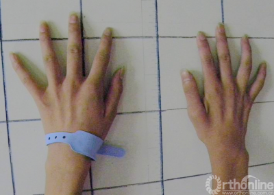 左:男性患者16岁,术前双手骨间肌萎缩