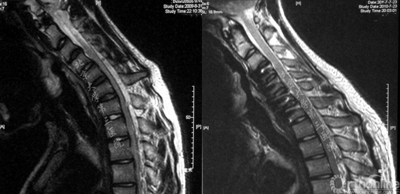 图3.中立位核磁和屈曲位核磁,屈颈位MRI可见下段颈髓前移,颈脊髓在屈颈位时受到挤压