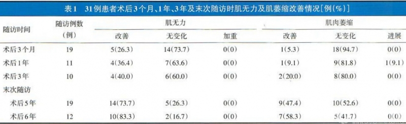 31例患者得到末次随访(术后5-6年),病情均停止进展。24例(77.4%)患者肌无力症状有所改善,16例(51.6%)患者肌肉萎缩症状有所改善。前臂肌力为4-5级,较术前平均提高1.3级;握力为3-5 kg,较术前平均增加56%。术后3月至末次随访时,肌无力及肌肉萎缩改善的比例逐年提高(表1)。
