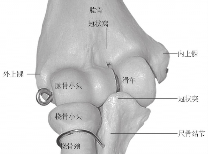 当冠状突极度屈曲活动时,肘关节在远端肱骨冠状窝的前方,而后方有鹰嘴窝适应鹰嘴极度伸直。冠状突为肘关节提供结构稳定,为对抗肘关节向后位移提供了前壁支撑(图1)。肘关节大约50%的稳定性由肱骨滑车和尺骨冠状突关节面构成的关节提供。