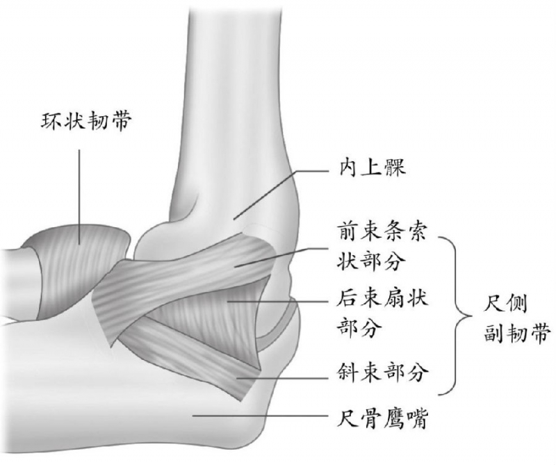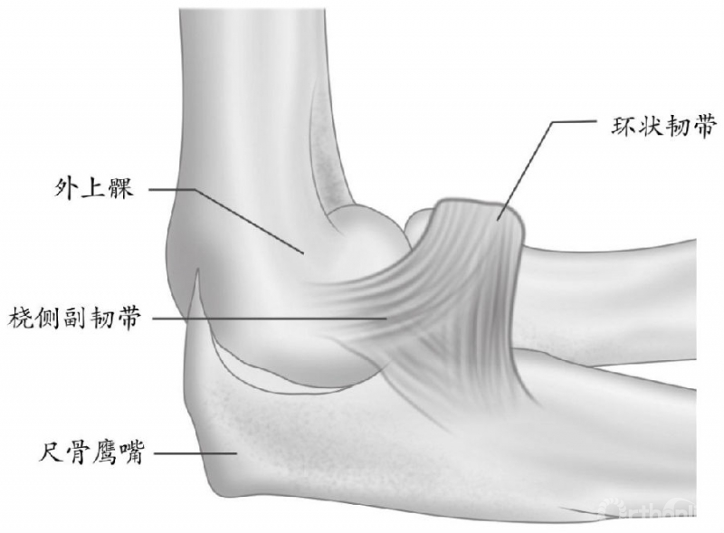 冠状突为肘关节前方关节囊提供附着点,肱肌附着在远端关节囊前面(图2),内侧尺侧副韧带附着在冠状突顶点内侧的结节部(图3和图4),这进一步加强肘关节的稳定性。